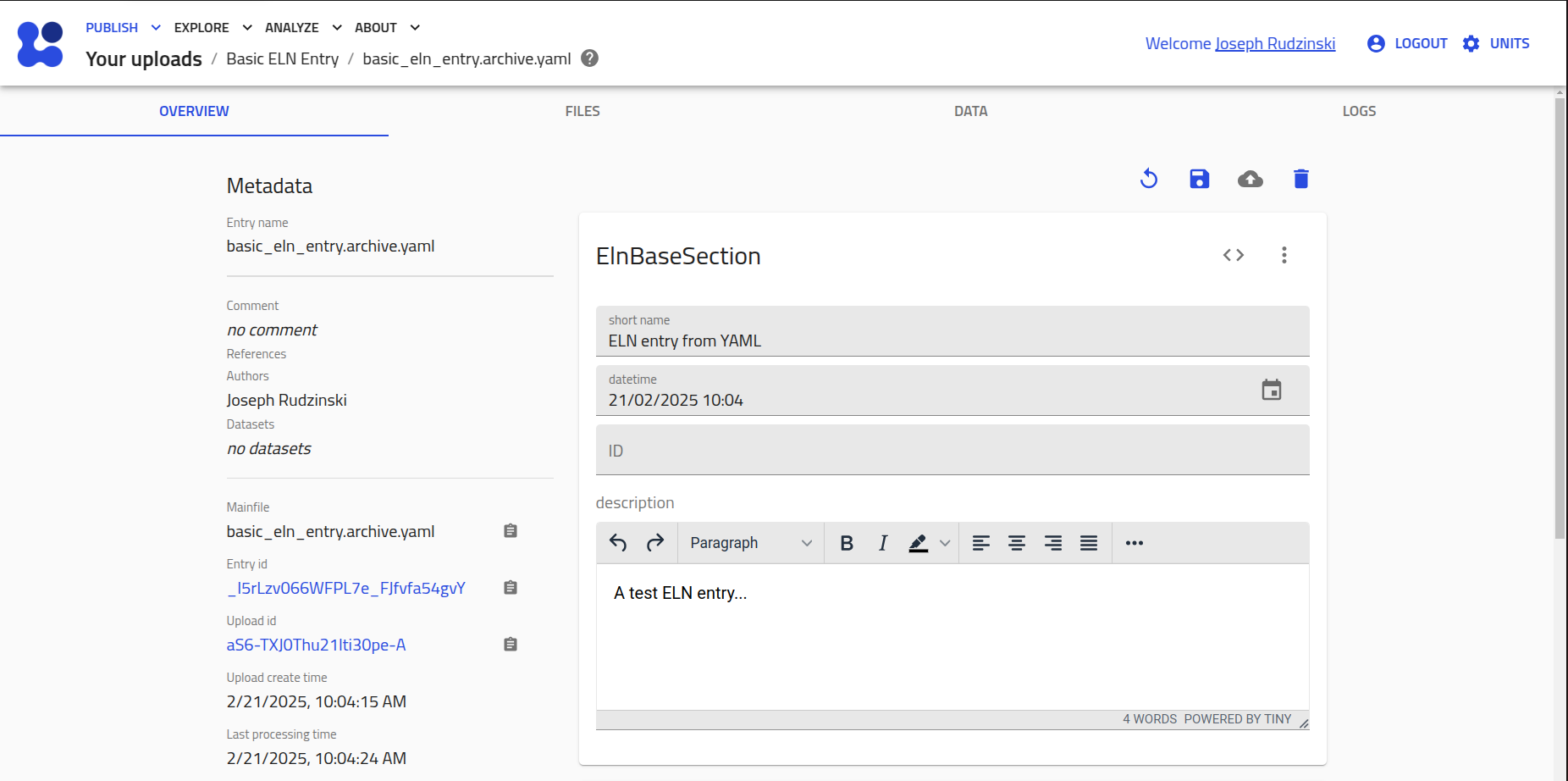 The data section is created and defined as type ElnBaseSection, meaning that we can populate all the quantities (e.g., name and description) living in this section (as seen in MetaInfo Browser > ELNBaseSection).